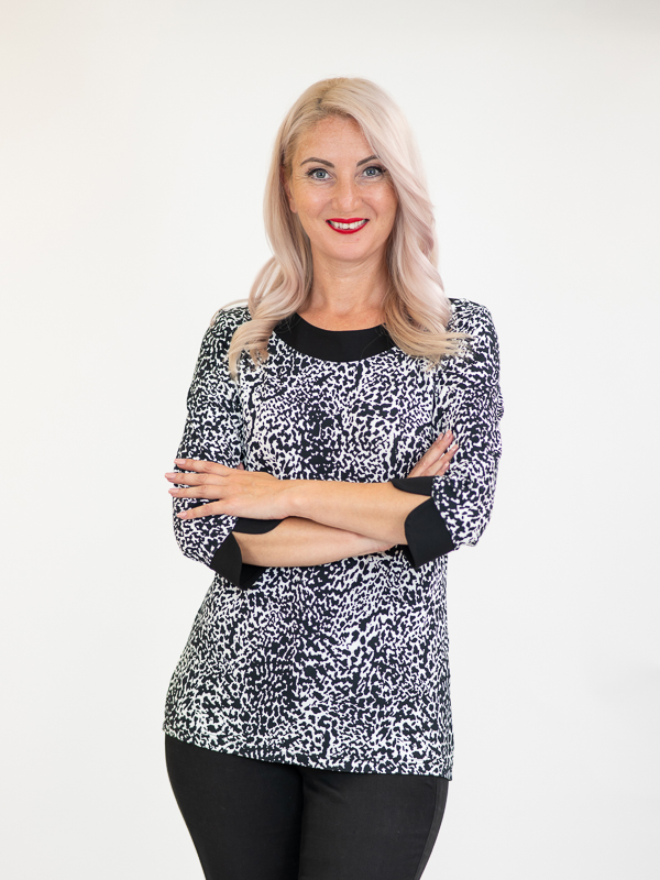 Ženska majica okruglog vratnog izreza . Majica je po sastavu 92% viskoza i 8% elastan, ugodna je za nošenje i lako se održava. Dezen je vrlo urban i u  bojama sezone. Ova majica odgovara svakom tipu ženske figure i prigodna je kako za svečanije prigode tako i za odlazak na posao te je idealna za toplije dane uz suknju ili pak hlače.